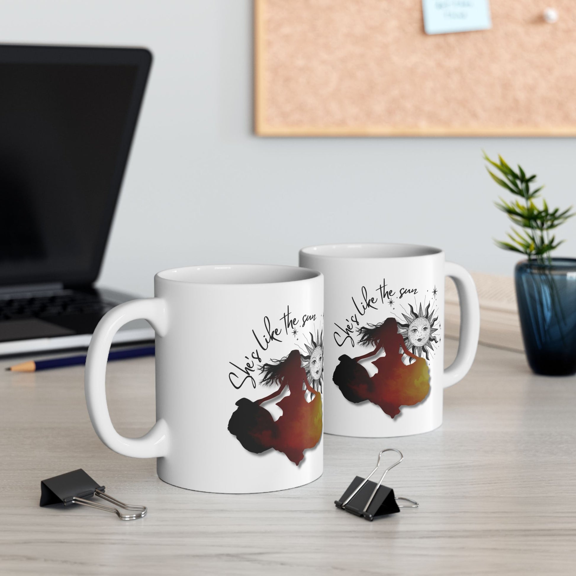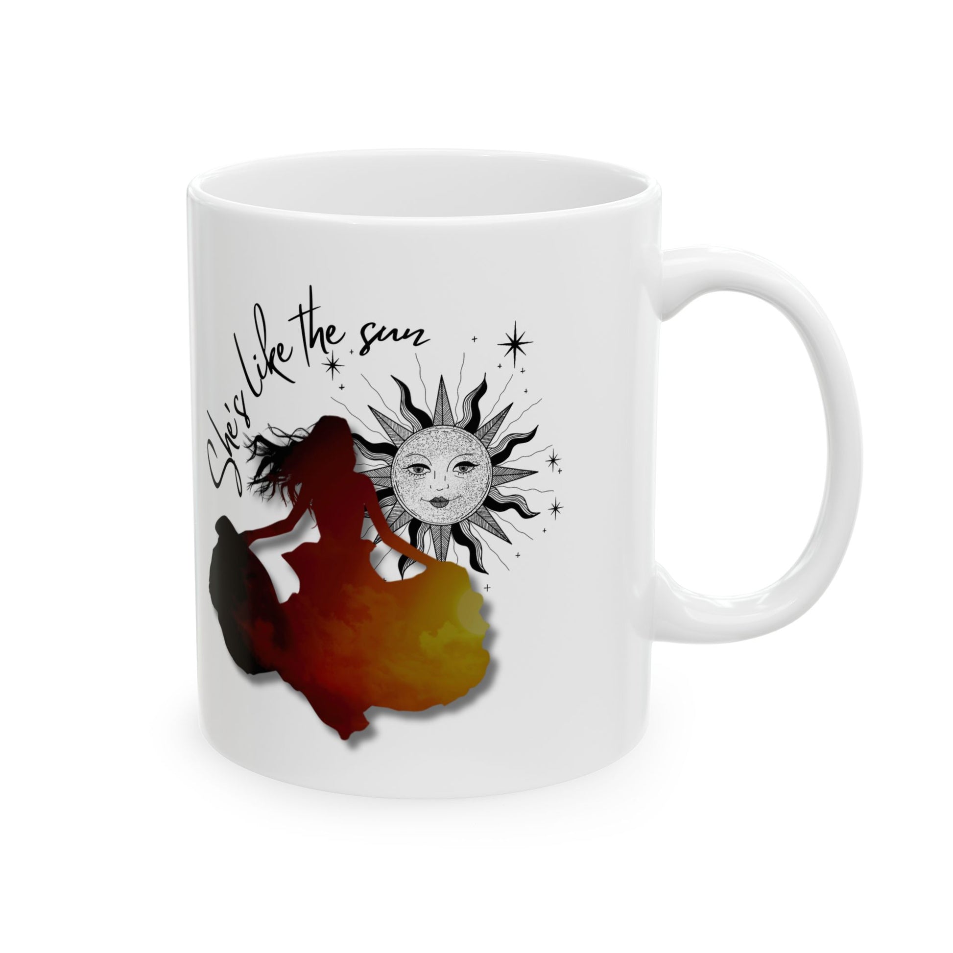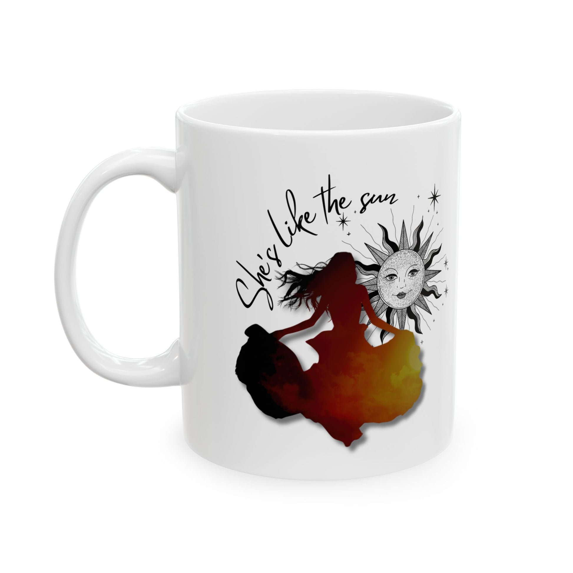 The She's Like the Sun Mug featuring a unique design that radiates a sense of whimsy and creativity. Ideal for art enthusiasts, dreamers, and book lovers alike, it's a staple for those who appreciate those who radiate light, like Lor. It's great for gifting during birthdays, holidays, or as a thoughtful present to someone special.