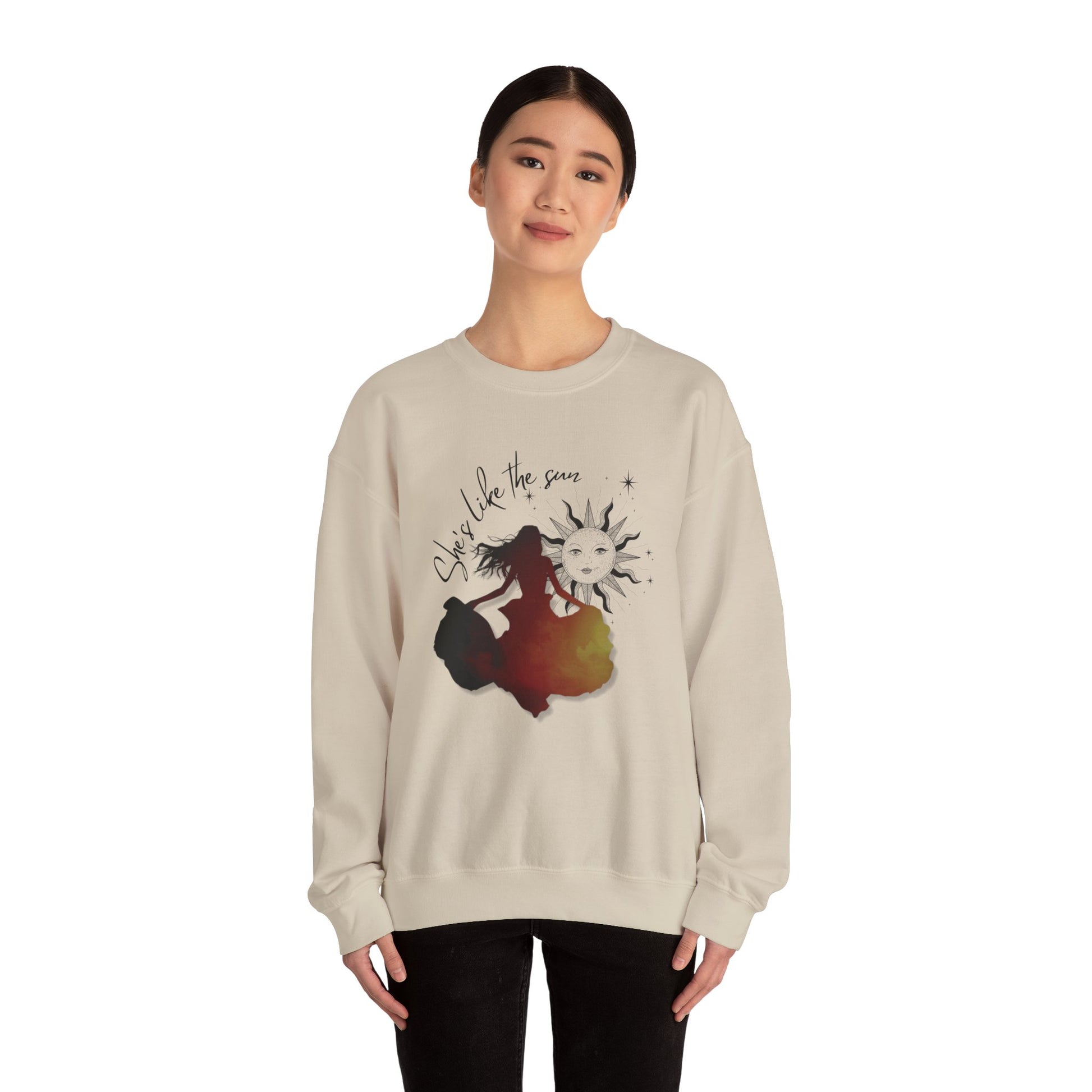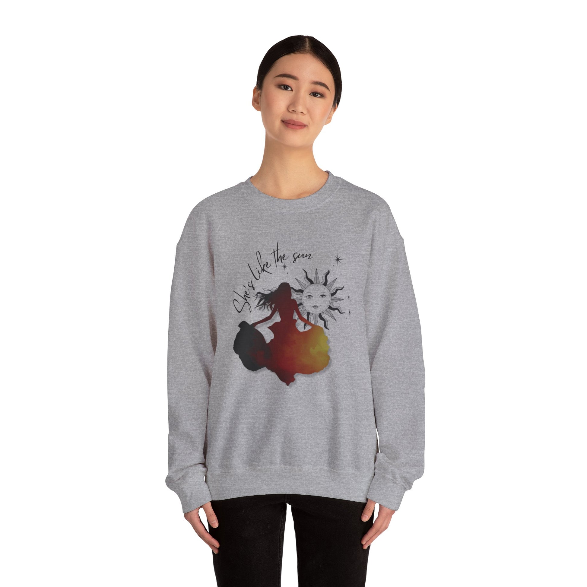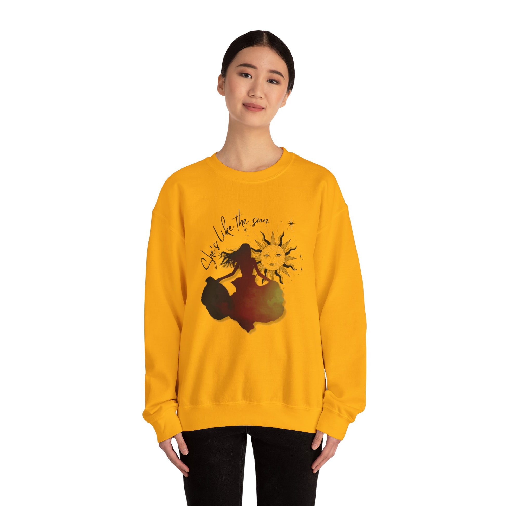 The She's Like the Sun Sweatshirt featuring a unique design that radiates a sense of whimsy and creativity. Ideal for art enthusiasts, dreamers, and book lovers alike, it's a staple for those who appreciate those who radiate light, like Lor. It's great for gifting during birthdays, holidays, or as a thoughtful present to someone special.